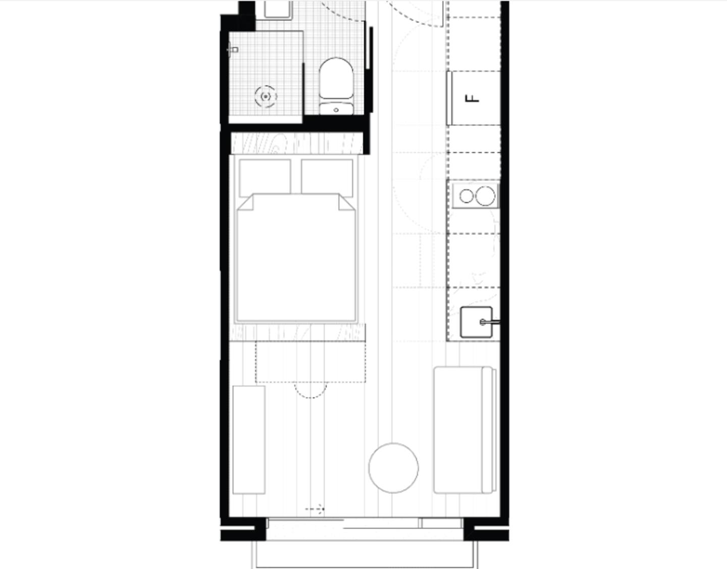 The sleek bathroom, with its modern walk-in shower, provides a spa-like experience to start or end your day. This is the ultimate in efficient luxury, where thoughtful design meets sophisticated living.