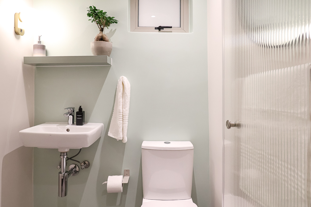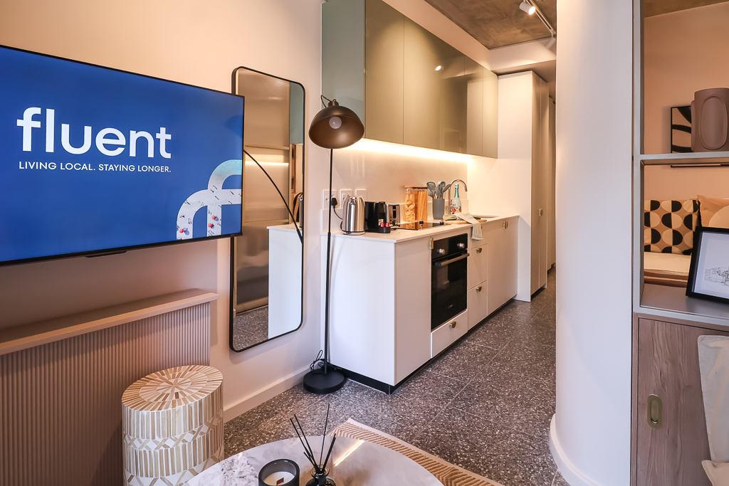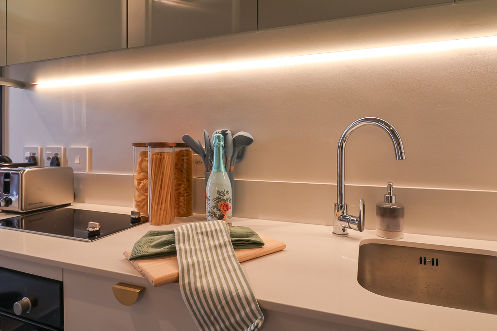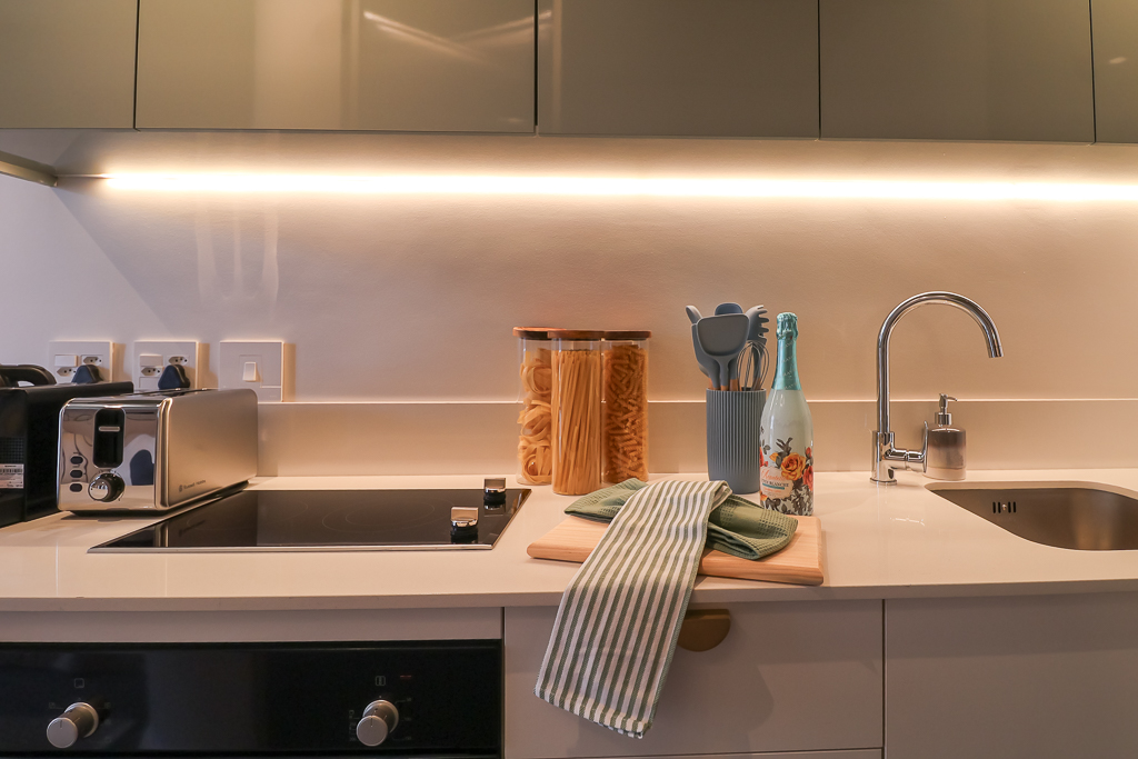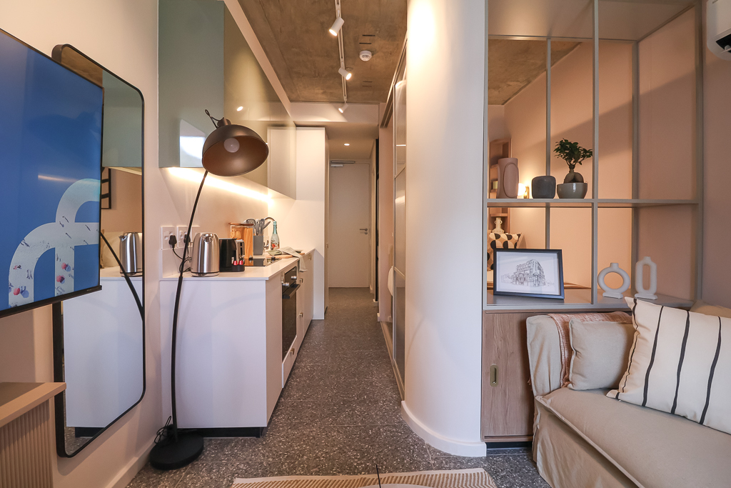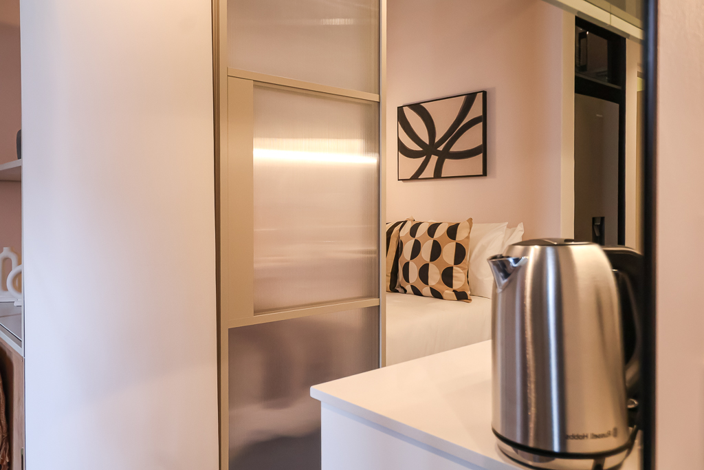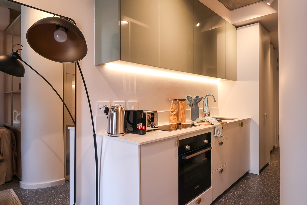 Compact and modern kitchenette for preparing light meals.