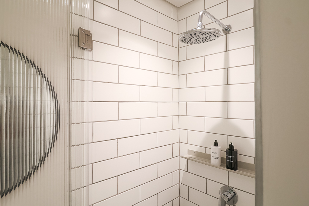 Pristine bathroom with a walk-in shower.